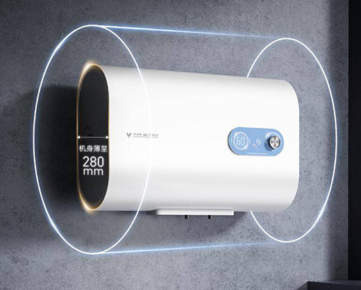 云米AI热水器Air 2 mini 的双胆储水设计,有别于传统厚重的单胆热水器,让机身薄至 280mm,几乎只有传统电热水器一半厚度,贴墙安装特别节能空间,也不怕洗浴过程中碰到头了。而其纤薄珍珠白机身和浅蓝色大彩屏组成的外观,也可以轻松融入现代浴室装修风格,亮银色电镀旋钮调温操作,即使家里老人也能轻松操作。