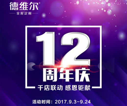 2017年是德维尔成立12周年之际,为了回馈新老客户对德维尔全屋定制的喜爱,特意推出12周年盛典活动,回报广大消费者对德维尔的厚爱,活动已全面正式上线,这场盛典千万不要错过!