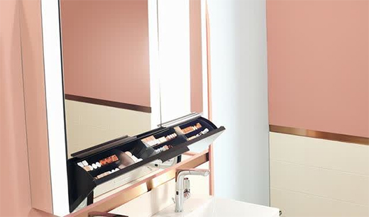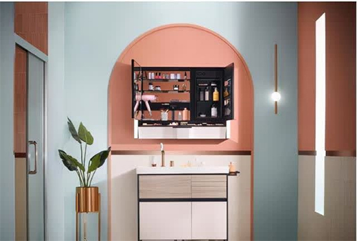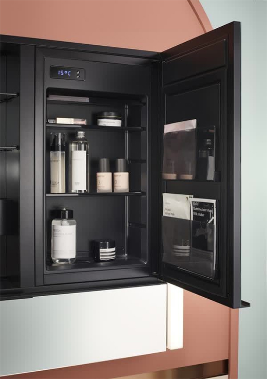 值得一提的是,镜柜还有内置“美妆冰箱”,不同季节可以按需调控温度,这个设计可以说是很人性化了。此外,镜柜下方的便捷式翻抽空间以透明隔层合理分隔成若干个分区,大小形状不一的彩妆用品均可整齐排列,可作为“口红吧”收纳约100支口红。