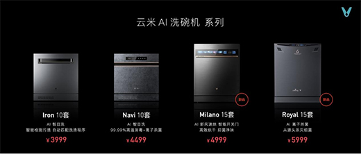 云米AI洗碗机系列,除了有省电和省时兼备的Milano 云米AI洗碗机(15套)外,还有Iron 洗碗机,AI 智目洗,智能检测污渍,自动匹配洗涤程序;Navi 洗碗机,AI智目洗,99.99%高温消毒+离子杀菌;Royal洗碗机,AI 离子杀菌,从源头杀灭细菌。云米满足日常不同中国家庭的洗碗需求,全方位提供优质洗碗机服务。
