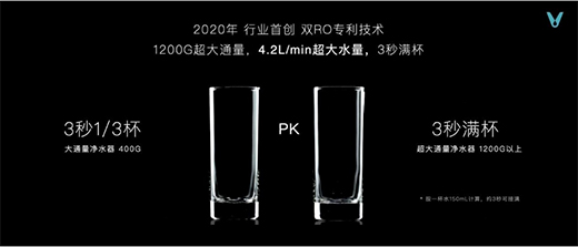 传统净水器普遍存在出水量太小的通病,对此,云米在2020年率先推出双RO专利技术,以1200G超大通量,4.2L/min超大水量,实现3秒满杯,解决出水量小的难题。2022年,云米净水器在通量上又⼀次实现飞跃性的升级,再次突破流速天花板。