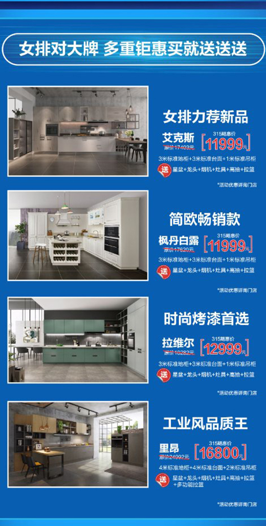 它来了,它带着新品来了!女排力荐新品之司米艾克斯橱柜,钜惠价仅需11999元/套,集实用与优雅于一身,以独特的珠光双饰面打造匠心独具的司米新刚需之王;全新的时尚哑光烤漆拉维尔,活动期间仅需12999元/套,时尚简洁的线条和配色是营造浪漫厨房的品质设计;此外,还有一直以来备受欢迎的简欧款枫丹白露橱柜,也推出了315钜惠价11999元/套。以上三款橱柜套餐均为3米标准地柜、3米标准台面和1米标准吊柜的配置,并且再送星盆龙头、烟机灶具和高抽拉篮。