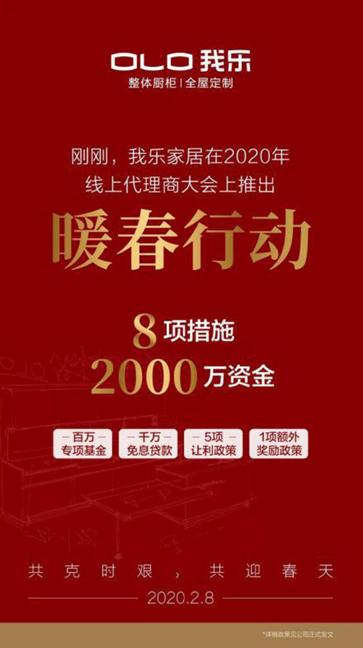 2020年初面对突如其来的“新冠”疫情,全国各地经销商的生意几乎处于停滞状态,我乐家居针对此紧急情况立即成立了“特别管理小组”,于2月8日对下属所有经销商推出“暖春行动”支持政策。