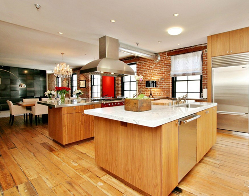 在你的印象中,厨房是不是就是白色、瓷砖、橱柜、厨具这样子的组合?在这幅创意家装厨房装修效果图中,款式复古的橱柜、吊柜搭配老旧的工业机械配件装饰,使整个厨房看上去就像穿越过来的一样。和简约整洁的现代厨房不一样,这个厨房的墙纸、吊顶都不是白色的,反而像是因为年代久远而泛黄了。最后,厨房的灯饰是点睛之笔,整个厨房没有大型灯具照明,而是由多个小型灯具构成局部照明,这样的效果让整个厨房复古、工业的风格更加凸显。