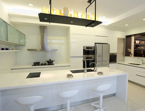 如果厨房与客厅是开放性的设计,这就要求厨房与客厅的设计风格相统一。在这幅创意厨房装修效果图中,厨房整体以白色、灰色为主色调,其在设计上更注重其实用性;简约的餐桌椅直排设计,可以让多人同时用餐,餐桌上的黑色吊灯简约而富有气质;一字型整体橱柜采用灰白色调很显厨房品味,同时也营造出简洁干练的视觉效果。微波炉、消毒碗柜等的一体化设计能够减少厨房的整体占地面积,为家庭留出更多的进食空间。这个厨房最大的特点就是厨房与餐厅、客厅融为了一体,解决了空间不足的问题。
