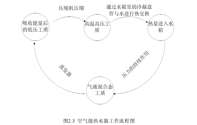 空气能热水器采用逆卡诺循环原理,利用工质(氟利昂)在系统中循环不断的状态变化,吸收空气中的热源,并与冷水进行热交换,实现持续供应热水的目的。工质(氟利昂)的循环共有四个基本过程:即压缩机的压缩升压过程、冷凝器的液化放热过程、节流阀的节流膨胀过程、蒸发器的蒸发吸热过程。其工作流程为:蒸发器中的低温低压工质(氟利昂),在空气中热能的作用下发生气化,气化后的工质(氟利昂)经过压缩机升压,变为高温高压的工质(氟利昂),再进入到沉浸在水箱中的冷凝盘管。冷凝管道中的高温高压工质(氟利昂)发生液化,并释放出大量的能量,水箱中的冷水在吸收大量的能量后温度不断升高,之后高压的工质(氟利昂)进入节流膨胀阀等节流部件。经过节流处理后,高压的工质(氟利昂)变为低温低压的气液混合态混合物,在风机的作用下进入到蒸发器中继续下一个循环。通过不断的循环过程,冷水的水温逐渐上升,并最终达到热水器设定的出水温度。其工作流程图如图2.3所示。