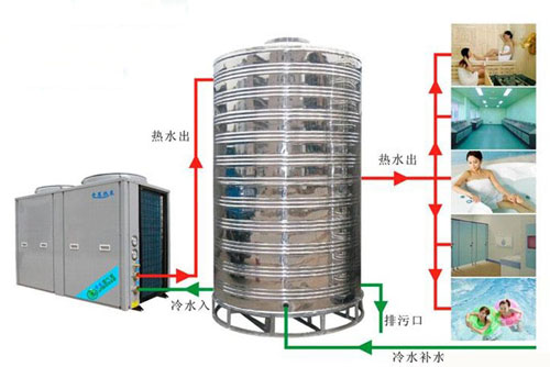 因热泵机组输出负荷相对较小,产热水速度较慢,热泵机组是先制热水备随时使用,而不是用水时才产热水,水箱是根据用户的日用水量设计,设计容量足够大,可实现24小时连续供水。
