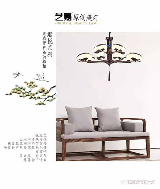 君悦系列,灵感源自松柏。松柏庄重肃穆,四季长青,历严冬而不衰,体现坚贞不屈的英雄气概和君子豁达坦荡的胸怀。灯罩如松叶针状成束,苍劲有力,灯体如松枝傲骨峥嵘。设计师们历经300多天的研发和完善,实现了从现代北欧到现代中式的成功跨越,打造更适合中国人的原创灯饰品牌。