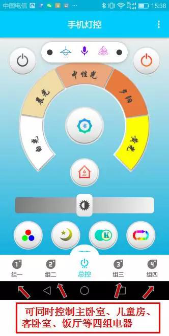 5挡无极调光,白光、晨光、中性光、夕阳、黄光,随意转换。光线充足、自然、柔和,让人舒服、放松。手机APP还可以同时控制主卧、儿童房、客厅等4组灯,智能又方便。