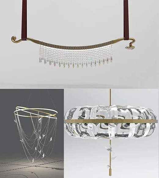 ▲奢简灯饰春季新品(上:“如意”系列;左下:“iris”系列;右下:“秋收”系列)