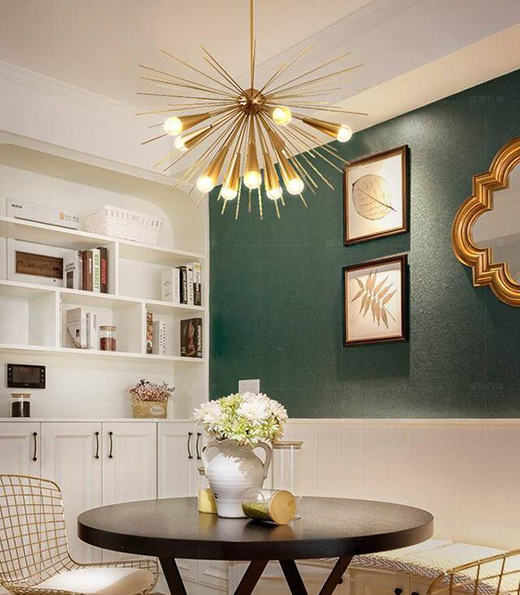 较浅色的北欧风空间中,如果出现玻璃及铁艺材质,就可以考虑挑选有类似质感的灯具。此外,北欧风格的装饰中有很多几何元素,灯饰也不例外,例如将一根根金属连接铸造成各种几何形状的灯具,中间简单地镶入一盏白炽灯,可打造出极简的北欧风格。