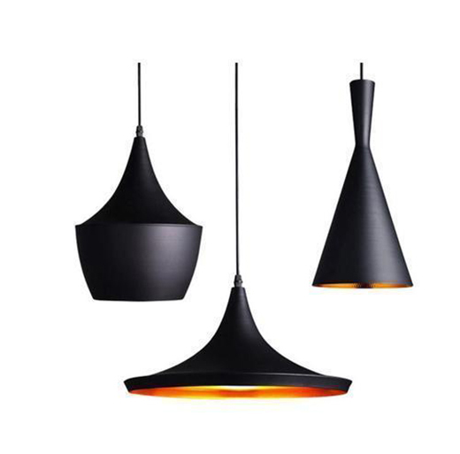 乐器吊灯是设计师从印度制作的黄铜容器获得灵感设计而成,这种吊灯分为小号长锥型、大号宽广型、中号饱满型。以黑色灯罩居多,圆润的亚光黑色表面与灯罩内部的黄色组合,既神秘又热情,令人感受到一种异域风情。