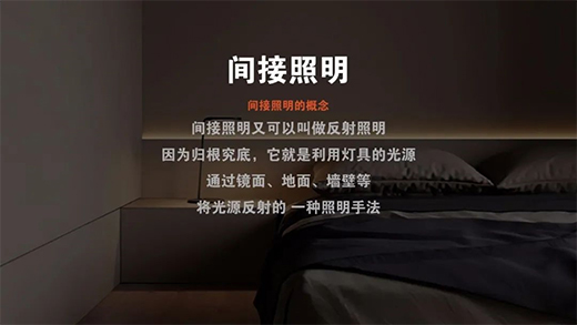 刚才讲解的主灯的照明方式采用的是直接光照明,直接照明最大的好处是,光可以被最大限度的利用,但是最大问题就是眩光问题,卧室空间比任何一个空间对防眩要求都要高。
