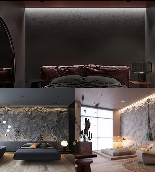 灯带的效果可以为卧室提供很好的氛围照明,同时也可以为睡前短暂的阅读或者,玩手机提供照明,尤其是,对于一些大面积使用肌理造型的墙面来讲,这种照明方式可以突出肌理层次感,当然防眩效果也是最好的。