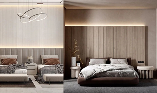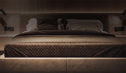 首先我们来看下床头部分的照明设计,床头部分的照明分为两个区域,一个是墙面床头照明,另一个是床头柜的照明,私宅空间中,枕头部分需要光,但是不需要使用直接光进行照明,如果有直接照明的射灯,很容易给人一种压迫感,所以我们可以在床头天花上方安装洗墙灯带。