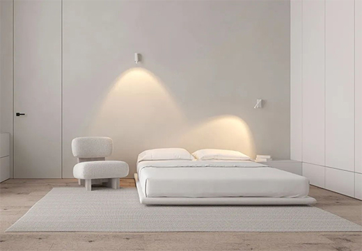 第二种使用射灯的照明方式在极简的空间中,我们采用比较多的依然是射灯照射,射灯的使用最可能做成眩光问题,尤其在夜间使用的时候,所以使用射灯的时候,照明一定要避开枕头方向。
