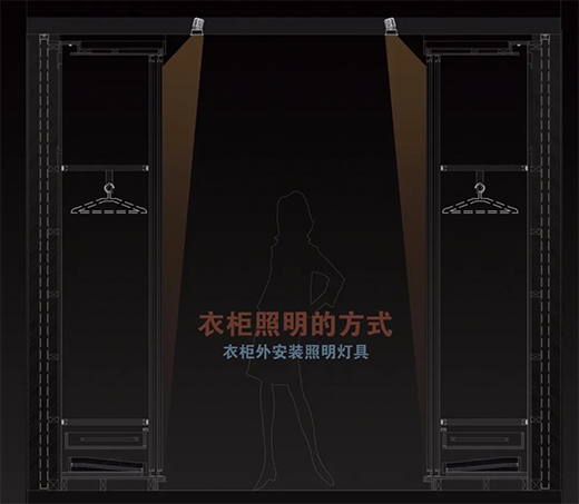 1)衣柜外安装照明灯具的方式,如果采用衣柜外安装方式的话,为了保证在柜门打开以后 ,我们可以无死角的去观察衣柜内的物品,建议选择洗墙型的筒射灯来照射,这种灯具的位置距离柜子的宽度,保持大约是柜子高度的三分之一。