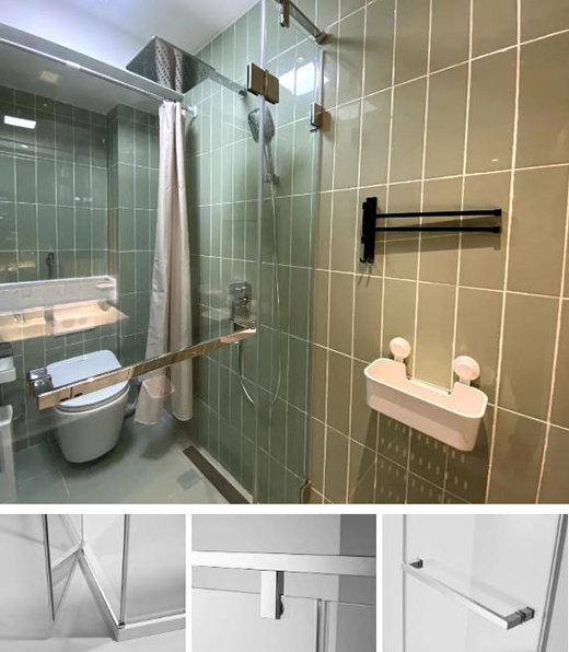 另外,仅2cm左右边框宽度极窄,放大了空间视觉效果,使原本狭窄的卫生间层次感十足,通过嵌入内置型材的方式,让支撑杆加厚至2.5mm以上,保证了足够的牢固,有效保证了门框强度,结构更为坚固耐用。