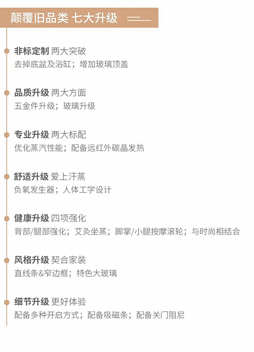 蒸汽时代蒸淋一体房,让消费者在家就可以享受汗蒸,从而释放心理压力、激发身体活力、保持肌肤弹力,获得年轻好心态。
