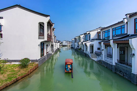 酒店更为特别之处,在于游客可乘船游河前往住处。曲水流觞,云雾弥漫,登上乌篷船,赏四周风光,将这一幅徐徐展开的山水画卷尽收眼底。恍惚间,仿若见岸边有一身着素色马面裙的姑娘回眸一笑,顾盼生辉,让本谈笑风生的游客噤声不语,唯恐惊扰了画中之人。
