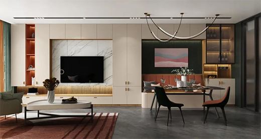 家居色彩可为浪漫点缀。北美深胡桃与菱形象灰皮纹搭配,自然柔和。细雨橘橙的活力,打破了空间的宁静,使空间洋溢着喜悦和活泼的氛围,以明快的色彩点缀情侣幸福愉悦的时光。