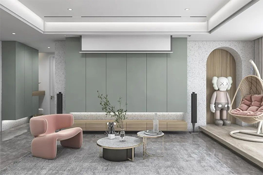 《简·居》客厅设计了投影幕布,两侧安置音响,打造家庭影院,给你带来置身于电影院般的感觉,同时拥有不被干扰的观影乐趣。