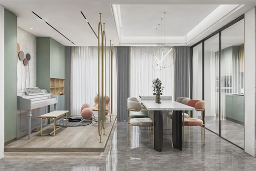 准备一桌亲手做的饭菜,弹一首动人心弦的歌。《简居》的餐厅整体为一个多功能休闲区,钢琴区与餐厅互通。一边是时光悠悠,你弹我唱,一边是柴米油烟,细水长流,诠释了爱情最好的模样。