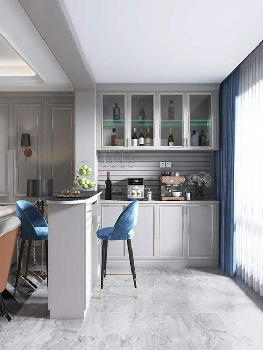香薰美酒最宜呢喃诉情。《艾菲尔Ⅱ》窗边设有吧台,休闲之时可在吧台边小酌畅谈。卡座上方配置软垫,增加卡座舒适度,两侧大玻璃窗增加采光率,挂有窗帘避免阳光暴晒。情人节和TA坐在阳台上,调制一杯酒,看着窗外风景,讲讲最近的趣事。
