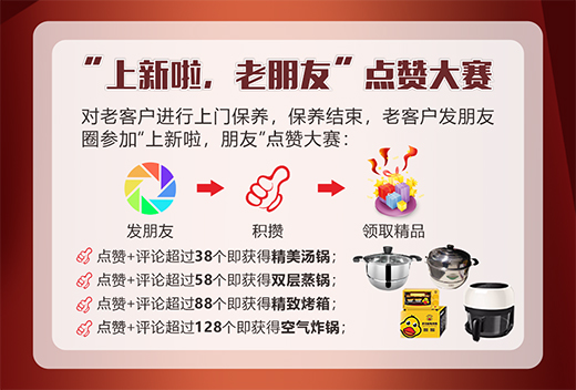 帅太针对老客户进行一年一度的上门保养,维护式的回访工作,回访结束后,被回访客户发朋友圈即可参加“上新啦,朋友”点赞大赛,领取精美礼品。