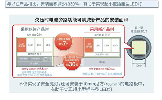 以往的产品如果要实现欠压工况下电流旁路功能,除了常规搭载的线性LED驱动器以外,还需要额外在PCB板上配置一些分立的元器件,这样总的元器件数目会达到21个,总的PCB板安装面积为83平方毫米。葛家明做了个对比:“采用BD18336NUF-M以后,总元器件数目可以减少7个,总的安装面积可以控制在60平方毫米之内,比以往的设计方案节约了30%的安装面积,很容易安装在10mm×10mm插座型很细小的PCB板上。”