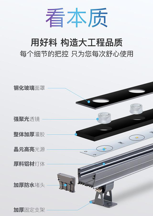 它是关键选项。施工企业一般趋向于采用髙压驱动的商品,缘故是布线简易,而具体比照,我更提议挑选24V低直驱动,一方面是出自于安全系数考虑到,特别是在运用在木制构造,如古典建筑、栈道等,相对性于髙压安全性能高些;另一方面,具体数据分析显示信息,80%之上的欠佳洗墙灯缘故出現在驱动或驱动方法上,低直驱动的商品免除了驱动欠佳的要素产生项,除非是是LED灯珠欠佳。因此 ,一般将低直驱动的LED商品称之为免维护保养商品。必须留意的是低直驱动安裝时要留意防止路线损耗,因此布线时要遵照“均值通电”的标准。