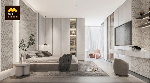 春天的美妙之处,在于大自然的生机勃勃,也在于卸下疲惫的舒享空间。卧室内墙柜一体化设计,墙板、柜内、层板具有圆点状吊灯,瞬间让整个空间变得温暖了起来,带给居者舒心、愉悦的享受。
