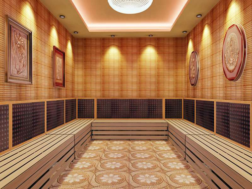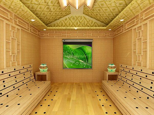 汗蒸房在通电后,安装在其中的加热板所含的锗碳元素和电气石元素受电能转换激发到一定温度时,产生一种具有不同波长的能源,其波长范围和强度范围恰好与人体自身释放的电磁波相吻合,并由人体纵深器官选择性吸收!从而促进人体死亡细胞 病变二聚体等的解体,增强人体的自身调节机制及免疫能力!本公司所采用的岩盘浴系统经日本权威机构检测结果表明其远红外线的放射率居世界首位。该远红外线能扩张血管,促进血流,并可使体内深处得到温热作用,对病人的患处起到保温及保护作用。