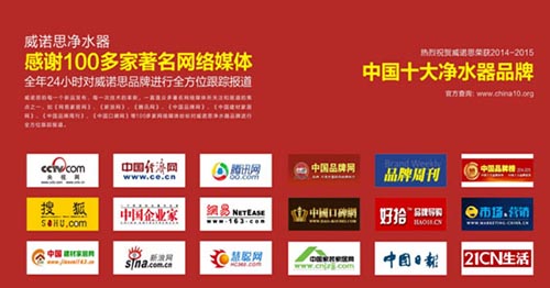 2015年,结果近6个多月的筹备、80多项的数据审核、各项产品品质的严格控制,近9万多名网的热心投票支持,威诺斯勇夺了“中国十大净水器品牌”(官方查询地址:中国设计网://m.vandepark.com/)、“中国著名净水器品牌” 两大荣誉称号。并同时得到中央电视台(央视网)、人民日报(人民网)、新华社(新华网)、新浪财经、腾讯家居、搜狐科技、凤凰财经、中国品牌网、中国建材家居网、中国企业家品牌周刊等近100多家媒体联合报道。