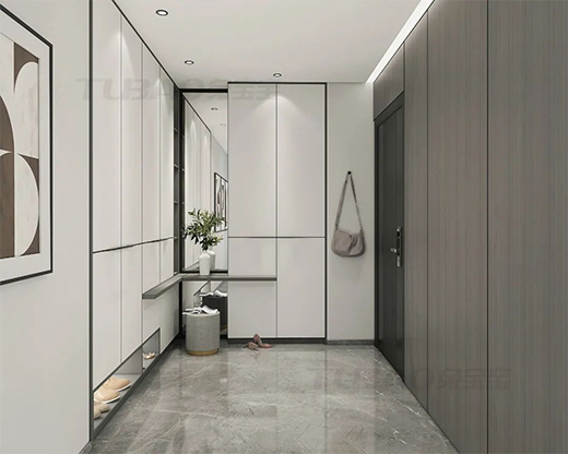 入户空间一侧是木饰面,另一侧白墙+嵌入式入户柜,其中入户柜大面积采用白色,中间增加了灰色的隔板作为柜面,放上植物,简单中还充满生机。