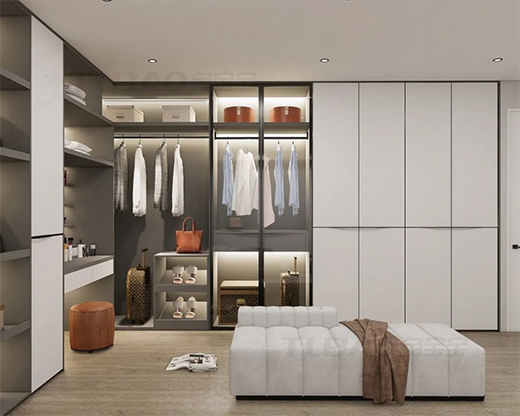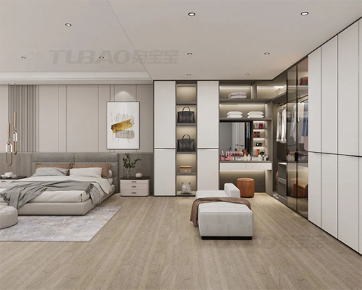 衣柜不够用,总是塞得满满当当,乱七八糟,就让衣帽间来帮忙。另外,衣帽间还配置了梳妆台,可以定制格抽,不用花大力气收拾桌面,和堆满一桌的情况说拜拜。