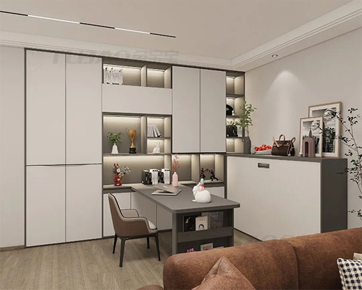 看书时需要一个能静下心来的空间,书柜制作的时候不需要花里胡哨,只要简洁实用即可。比如素沐系列的书柜,白色可以帮助我们放空放松,深色用作开放区柜体和书桌,则可以让我们回归学习的理性。书桌设计隐藏小妙招,就是侧面的杂志架设计,营造氛围感的同时还有提醒自己看书的作用。