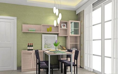 这个空间的柜体造型给主人家的带来了很多浪漫而优雅的味道,灯饰的造型烘托出来的是温馨的气息,充满了雅致的格调。吊柜和矮柜之家的结合是相当不错的,墙面的绿色和窗帘之间相呼应,有一种大自然的魅力,白色的窗帘看上去非常地优雅。