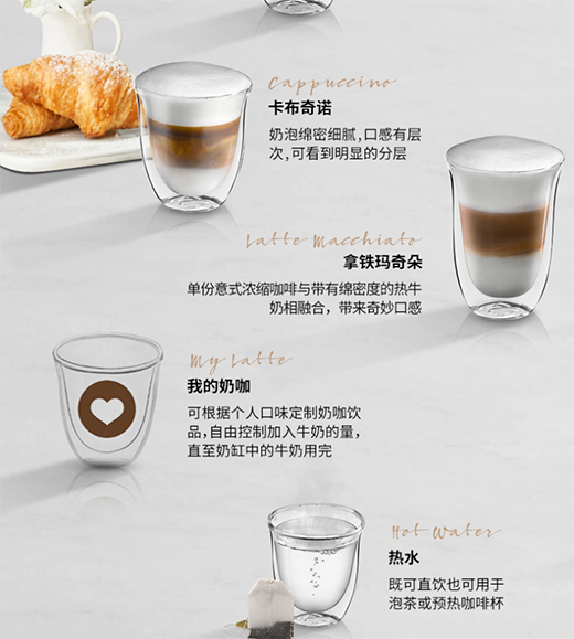 从意式浓缩咖啡、咖啡、卡布奇诺等,再到根据个人口味定制私人奶咖饮品,德龙全自动咖啡机E LattePro和E LattePlus均能完美涵盖以上所有需求,让手残党也可以制作出美味咖啡。