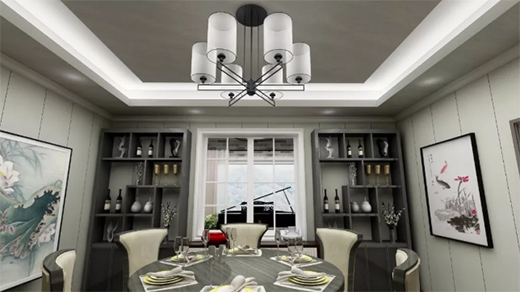 除了在客厅上,餐厅上用艺术涂料涂刷也是别有一番滋味,质感柔和、经久耐看,纹理自然且不张扬,有效提升空间档次,配合特选的吊灯效果更呈现了多层次的家居艺术质感。
