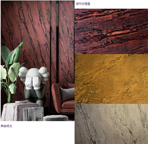 艺术涂料的面层在色彩展示的同时,融合高光材质的运用,施工后的光泽度较传统壁材更自然、更光亮,展现出来的效果更高雅、大气。