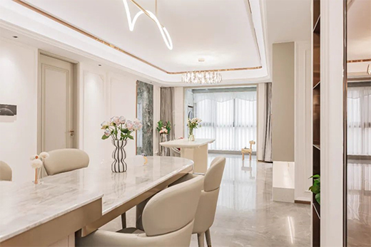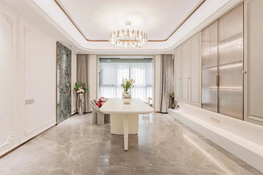 本案例整体以奶白色调为主,辅以巴黎世家瓷砖将法式的轻奢质感和浪漫情怀融入室内设计中。在设计师的巧思妙想下,巴黎世家瓷砖萨罗尼克的优雅大气、艾伦灰的浪漫格调,搭配法式轻奢理念,完美地诠释了轻奢高级的家居氛围,同时让人对精致生活有着无限憧憬。