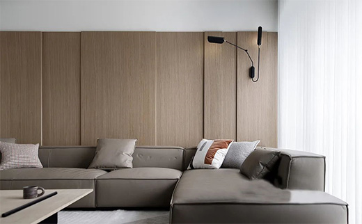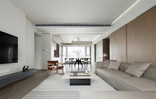 以木饰面从玄关延展到客餐厅,打破玄关到客餐厅空间的矮横梁,让客厅和餐厅两个空间可以联系起来。增加空间整体的围合感,高低错落的层次变化,又在细腻中勾勒出空间秩序。