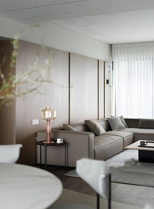 米白、浅奶茶色+大地色系作为空间底色,将空间氛围渲染得静谧悠闲,柔软的布艺沙发,木质背景墙的韵律与层次,竖百叶帘透出阳光的影子,舒展的绿植散发出点点生机。