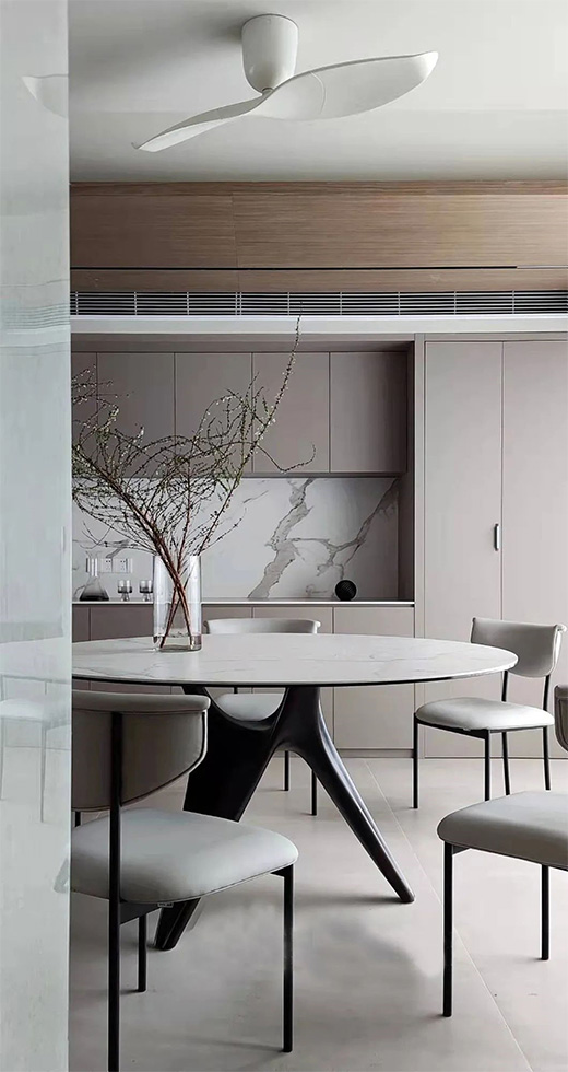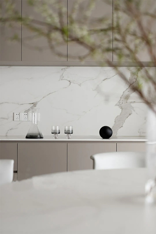简单利落的线条分割与曼妙的岩板纹理相映衬,秩序感的空间中也不缺乏灵动,大面的落地窗与竖百叶,将光影迎进室内,让生活贴近自然。