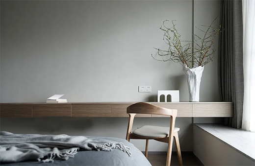 步入式的衣帽间以及床尾的悬浮桌面,则是对卧室功能性的补足。衣柜采用通顶设计,顶天立地的好处在于,拉伸层高,让空间更具开阔感;其次一门到顶的设计,会显得非常之高级,简约却不简单,气质自在其中。