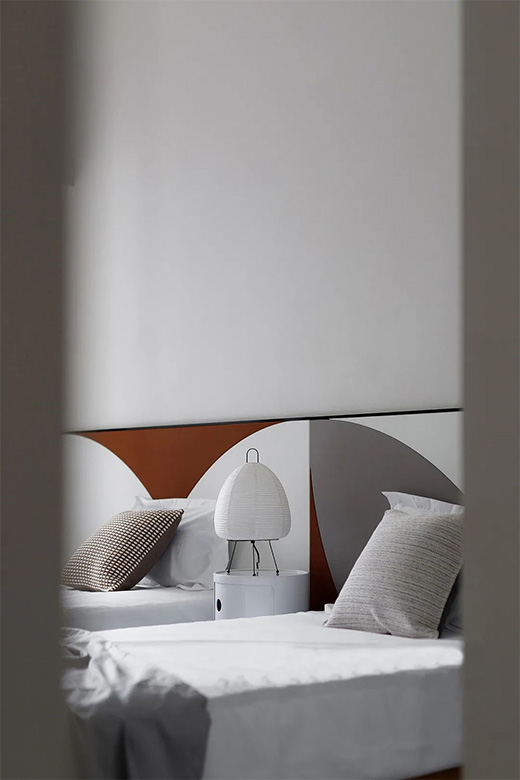 无需惊艳,对于充满私人属性的卧室,尽可能贴合居住者的个性。于是有了以不规则的几何色块装饰的床头背景,让小孩房显得更加灵动活泼。