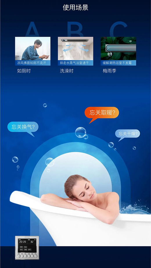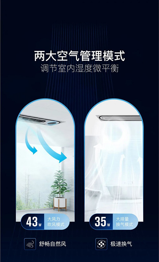 温湿双控,沐浴同时,有效控制室内湿度,两大空气管理模式,调节室内湿度平衡,卷走湿气,保持卫生间干燥,避免因湿度过大地面湿滑,出现人员摔倒的现象,尤其对于家中有老人/小孩的家庭,一款带控温控湿的浴室取暖器尤为重要。