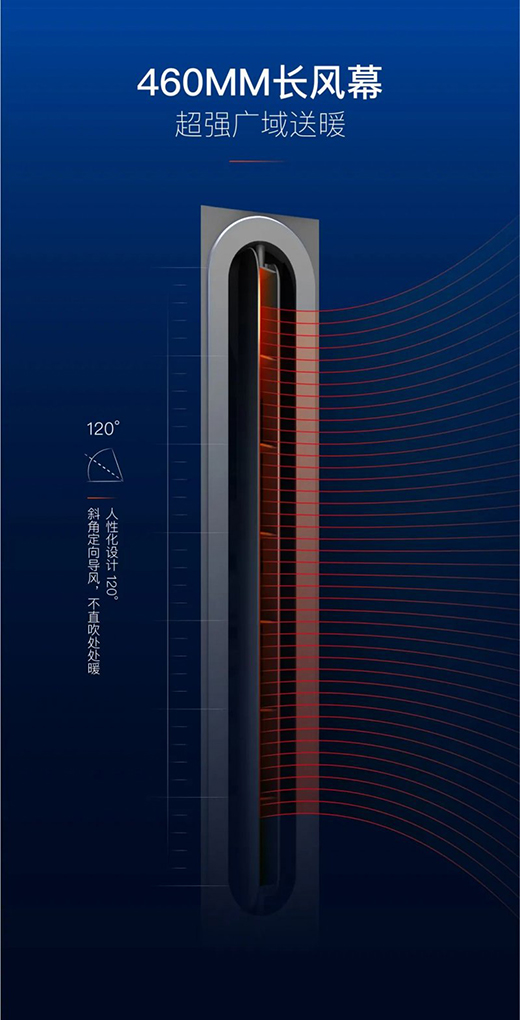 一款很懂你的浴室取暖器,360°环抱式循环取暖,带来从头到脚的满满暖意,400MM长风幕送暖,120°斜角定向导风,不直吹,人性化设计,避免传统大灯泡式取暖器“烫头皮”的困恼。