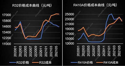 据产业在线统计,2020年以来,热门产品R32单吨亏损2000千元上下,而R410a也是受到今年的政策影响才进入止损区间,市场倒挂现象明显。